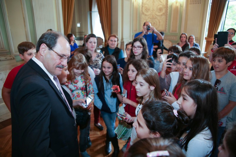 Após acomodar as 25 crianças entre 9 e 11 anos em volta da mesa do gabinete, Sartori pediu que todos se apresentassem, momento que rendeu muitas brincadeiras e histórias. Aí, a visita de estudos começou. Os alunos preparam cinco perguntas, caso tivessem oportunidade de entrevistar Sartori.