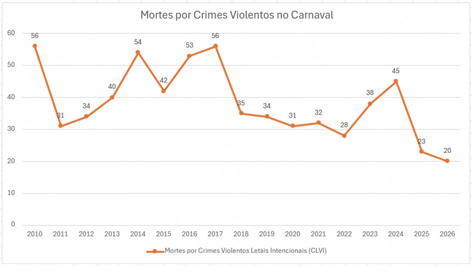 O mesmo ocorre em relação ao roubo de veículos, que registrou 13 ocorrência no Carnaval de 2026, o menor número de toda a série. Em relação a 2010, que teve 133 ocorrências de roubo de veículos, a queda é de 90%. O ano de 2017 também apresentou o pico neste tipo de ocorrência, com 257 registros. Para este caso, a queda em 2026 é ainda maior, chegando a 95%.