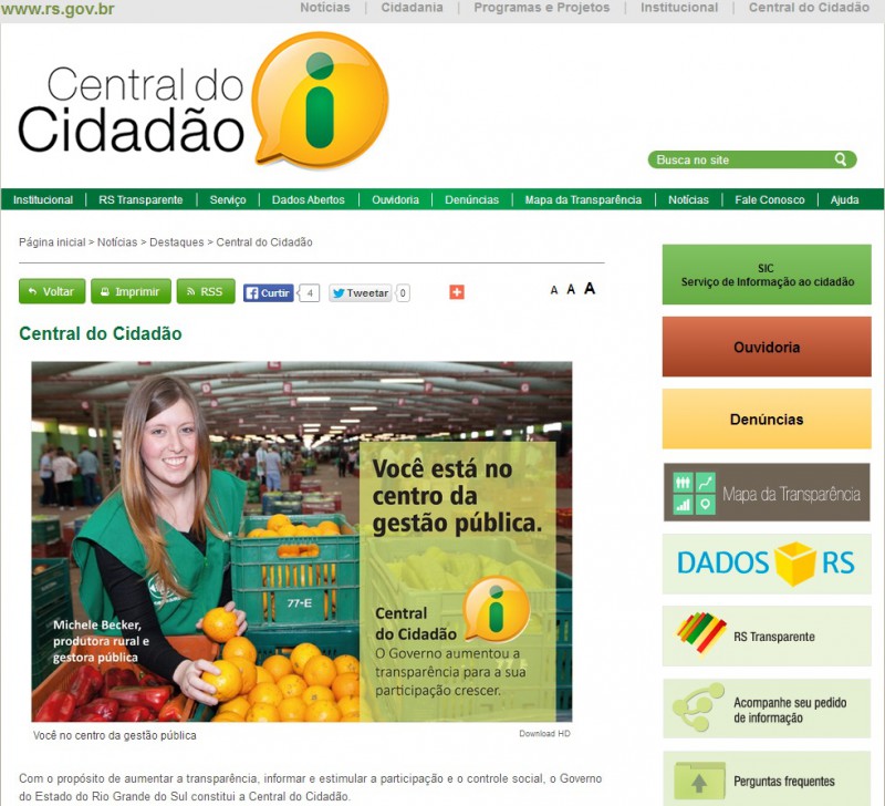 O projeto aborda o portal Central do Cidadão e as ferramentas implementadas pelo Governo gaúcho para atender as determinações da Lei de Acesso à Informação. Desde 2011, o Serviço de Informação ao Cidadão está em constante atualização. Atualmente, a Central do Cidadão conta com serviços de transparência ativa e a solicitação de informações, canais de Ouvidoria e Denúncias, Cartilha da Transparência, Mapa da Transparência e o portal de Dados Abertos.