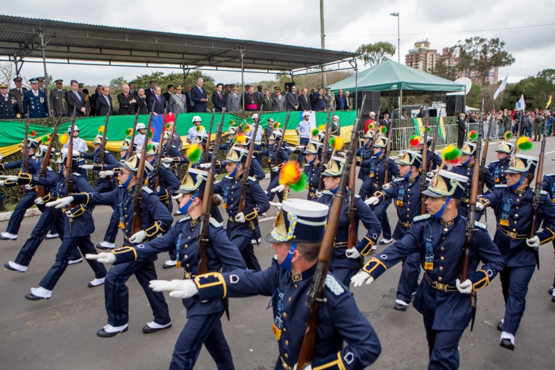 Após a revista da tropa, o governador, juntamente com o Comandante Militar do Sul, general de Exército Antônio Hamilton Mourão, e o prefeito de Porto Alegre, José Fortunatti, hasteou o pavilhão nacional e as bandeiras do Rio Grande do Sul e da cidade de Porto Alegre. Em seguida, subiram ao palanque para assistir à passagem dos grupamentos. Desfilaram mais de 200 viaturas, incluindo os blindados do Exército, Aeronáutica, Brigada Militar, Corpo de Bombeiros, Polícia Rodoviária Federal, Polícia Civil, Empresa Pública de Transportes e Circulação e da Guarda Municipal.