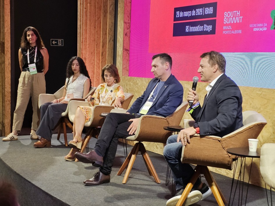 O Programa Professor do Amanhã, da Secretaria de Inovação, Ciência e Tecnologia (Sict), foi tema de painel no RS Innovation Stage na tarde de quinta-feira (26/3), durante o South Summit Brazil, evento correalizado pelo governo do Estado. O debate foi mediado pela titular da Sict, Simone Stülp, e contou com a participação da secretária da Educação, Raquel Teixeira, do professor da Fundação Dom Cabral, Alsones Balestrin, do reitor da Pontifícia Universidade Católica do RS (PUCRS), Manuir Mentges, e da estudante de Letras da PUCRS e bolsista do programa, Cristiane da Silva.