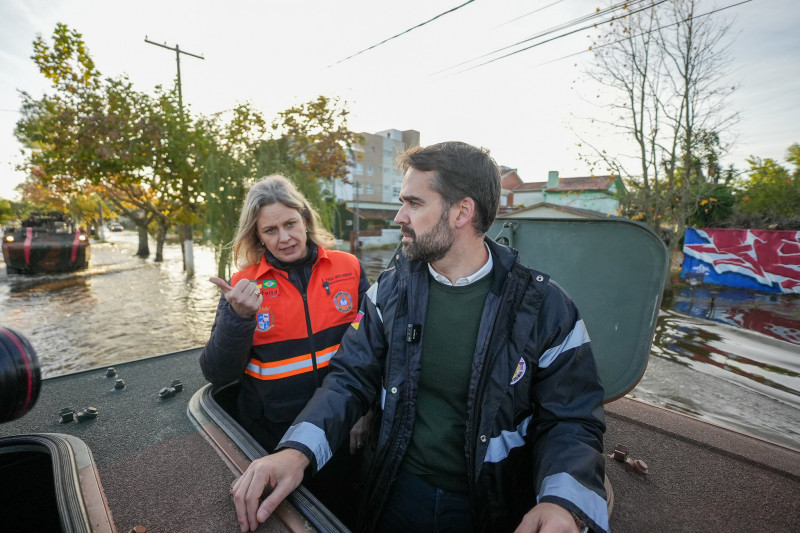 O governador Eduardo Leite esteve em Pelotas nesta quarta-feira (29/5) para vistoriar as áreas afetadas pelas cheias no município. A região sul do Estado foi uma das últimas a sofrer com a elevação das águas, que escoaram do Guaíba para a Lagoa dos Patos. Ao lado da prefeita Paula Mascarenhas, Leite passou pela praia do Laranjal a bordo de veículo anfíbio do Exército e verificou a situação do local, invadido pelas águas. Eles também caminharam pela Estrada do Engenho, que fica às margens do canal São Gonçalo. O governador conferiu o trabalho realizado na casa de bombas e o dique que protegeu a área de um impacto maior.