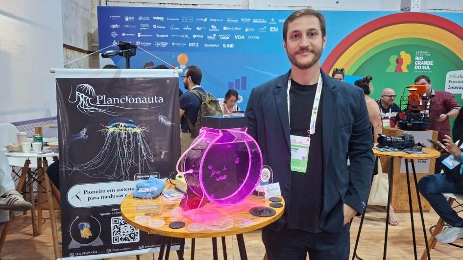 Entre os expositores, a startup Planctonauta, de Rio Grande, desenvolveu um método para o cultivo ornamental de água-viva. "Nossa proposta é popularizar o cultivo desses animais e permitir que você tenha na sua casa ou no seu empreendimento. Há trabalhos que mostram que as águas-vivas podem trazer um bem-estar ao ser humano, uma redução de estresse e ansiedade. Somos uma empresa pioneira, tanto na reprodução desses animais, como na produção do sistema de cultivo”, detalhou o expositor Guilherme Von Montfort.