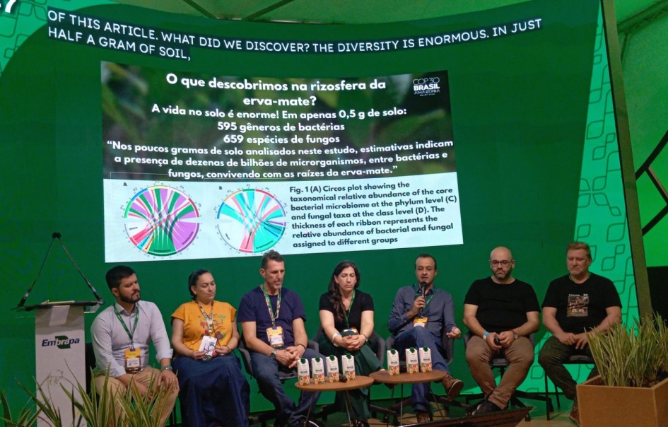 A erva-mate foi tema de debate na COP30, em Belém (PA), no domingo (16/11). No painel “Erva-mate e o futuro verde: descarbonização, florestas e comunidade”, o governo do Estado, por meio de pesquisadores do Departamento de Diagnóstico e Pesquisa Agropecuária (DDPA) da Secretaria da Agricultura, Pecuária, Produção Sustentável e Irrigação (Seapi), apresentaram os estudos que mostram o potencial da erva-mate para promover a descarbonização e aumentar o carbono no solo.