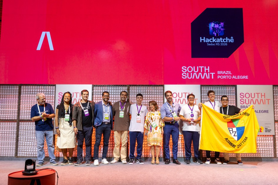 O governador Eduardo Leite participou, nesta quinta-feira (26/3), da final do HackaTchê, durante as atividades do South Summit Brazil 2026, evento correalizado pelo governo do Estado do Rio Grande do Sul. A equipe Sentinela, da Escola Estadual de Ensino Médio Alexandre Zattera, de Caxias do Sul, sagrou-se vencedora da atual edição.