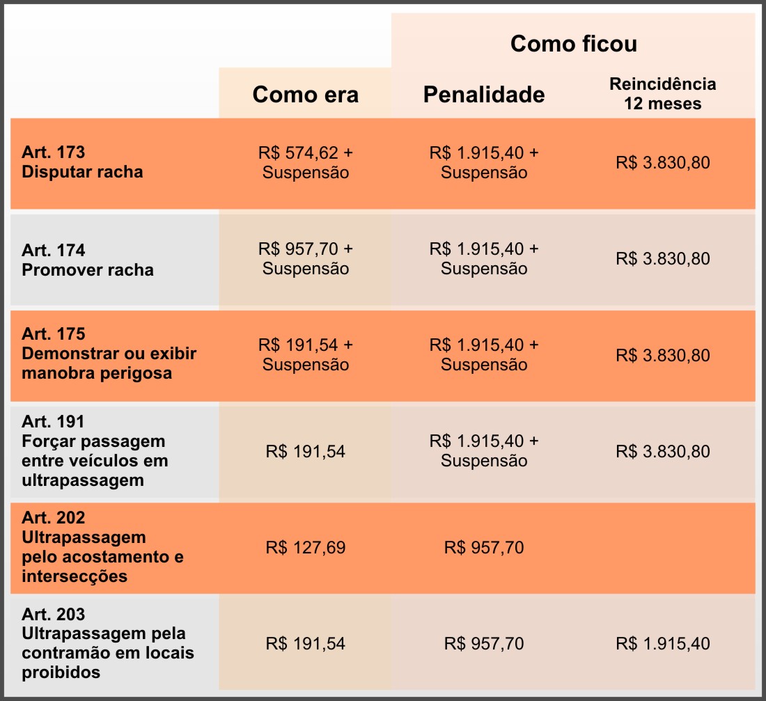 As condutas previstas nos artigos 173 (disputar racha), 174 (participar de racha) e 175 (demonstrar ou exibir manobra perigosa) do CTB passam a ser infração gravíssima, e a multa terá fator multiplicador de 10, ou seja, 10 vezes o valor da infração gravíssima, que é de R$191,54. A penalidade para essas três condutas passa a ser de R$1.915,40, além da já prevista suspensão do direito de dirigir. A reincidência também passa a ser punida com maior rigor, chegando a R$ 3.830,80, se a mesma infração for cometida no período de 12 meses.