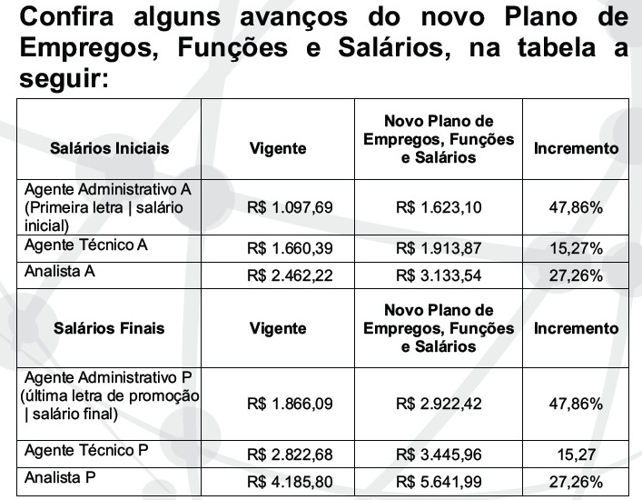 Outro avanço significativo refere-se ao adicional de capacitação. Agentes Administrativos e Agentes Técnicos (ambos os cargos com exigência de nível médio) podem ter um incremento no salário que varia entre 5% e 52%, caso tenham formação em nível superior ou pós-graduação (que pode variar de especialização a doutorado).