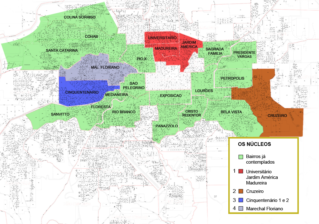 Mais sete bairros de Caxias do Sul terão policiamento comunitário ainda neste semestre. Universitário, Jardim América, Madureira, Cruzeiro, Cinquentenário I, Cinquentenário II e Marechal Floriano serão divididos em quatro núcleos (confira o mapa), e cada um desses núcleos receberá três policiais militares. O anúncio da ampliação foi feito nesta quarta-feira (1) pelo secretário da Segurança Pública, Airton Michels, durante o seminário de avaliação dos quatro meses de implantação do projeto em Caxias do Sul.