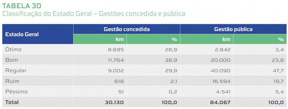 As rodovias sob gestão pública estão com 72,8% da malha avaliada classificada como Regular (47,7%), Ruim (19,7%) ou Péssimo (5,4%).