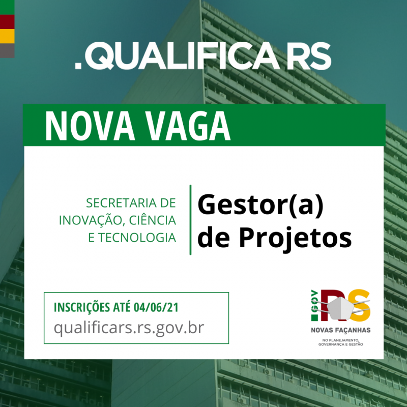 O Qualifica RS, programa do governo estadual de seleção de profissionais para funções estratégicas na administração, chega a sexta edição com a abertura de duas vagas para atuação na Secretaria de Inovação, Ciência e Tecnologia (Sict). O cargo em disputa é o de gestor(a) de projetos, sendo responsável por projetos dos programas estratégicos Startup Lab, GameRS e Techfuturo. A vaga é destinada apenas a servidores e funcionários públicos da administração direta e indireta de qualquer esfera (municipal, estadual ou federal).