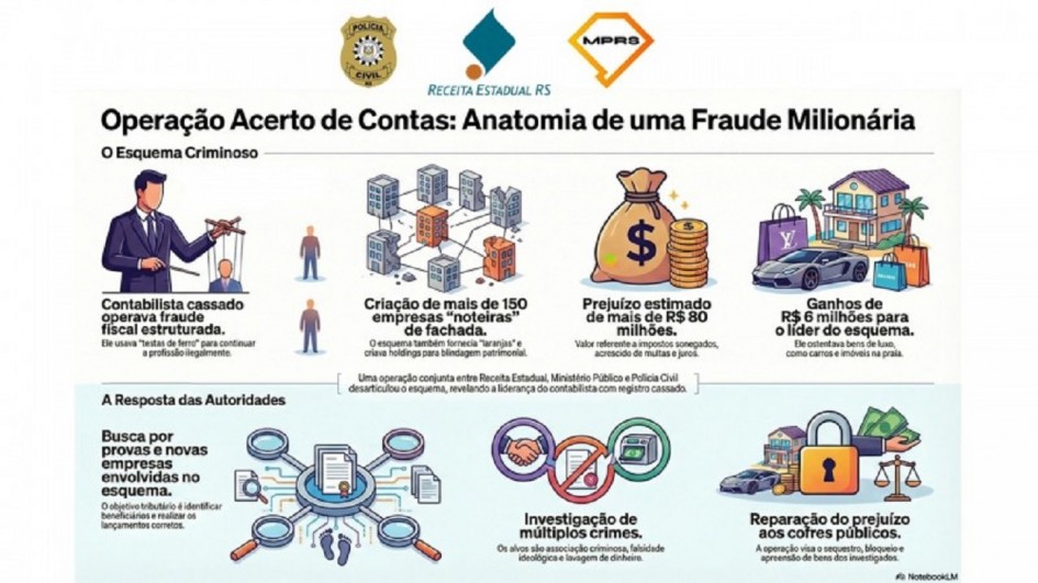 Detentor de extensa ficha policial, com longo histórico de fraudes praticadas e com registro profissional cassado pelo CRC-RS desde 2023, continuava a atividade contábil por meio de terceiros, que exerciam o papel de “testas de ferro”. Entretanto, na prática, mantinha o comando das operações, atuando como mentor das fraudes fiscais estruturadas praticadas.