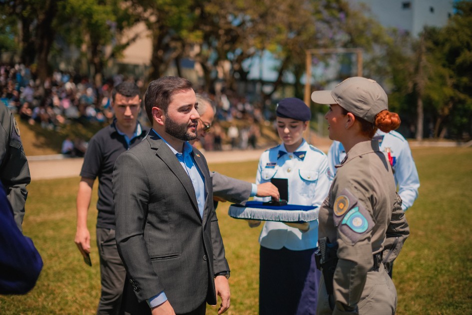 Gabriel saudou os formandos e falou sobre os avanços da segurança pública no Rio Grande do Sul. “Hoje celebramos um marco importante para a segurança pública do Rio Grande do Sul. Esta formatura representa não apenas uma conquista individual dos homens e mulheres que chegaram até aqui com dedicação, disciplina e coragem, mas também um avanço para todo o Estado. Temos alcançado resultados históricos na redução da criminalidade, ampliado investimentos em estrutura, tecnologia e efetivo, e seguimos comprometidos com a valorização das carreiras. Me sinto muito honrado de ser paraninfo dessa turma promissora. A formatura de hoje é mais um passo decisivo para fortalecer a Brigada Militar e garantir um futuro ainda mais seguro para todos os gaúchos”, afirmou Gabriel.