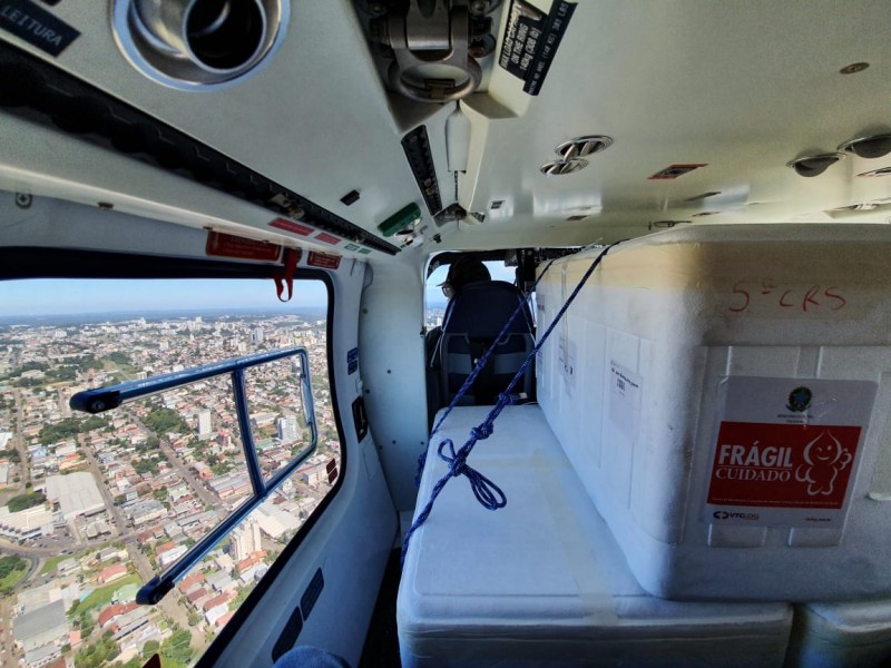 Avião e helicópteros da Brigada Militar e Polícia Civil levaram doses da CoronaVac para cinco municípios na manhã desta terça