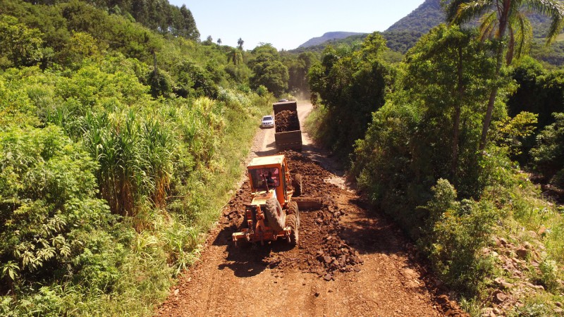 Em Agudo, na Região Central, são recuperados 19 quilômetros de estradas vicinais nas localidades de Linha Teutônia e Canto Católico. O município foi contemplado com a contratação de 800 horas de caminhão para auxiliar no transporte do cascalho utilizado na recuperação das vias. A prefeitura também está empregando uma escavadeira hidráulica, um rolo compactador, uma motoniveladora e caminhões.