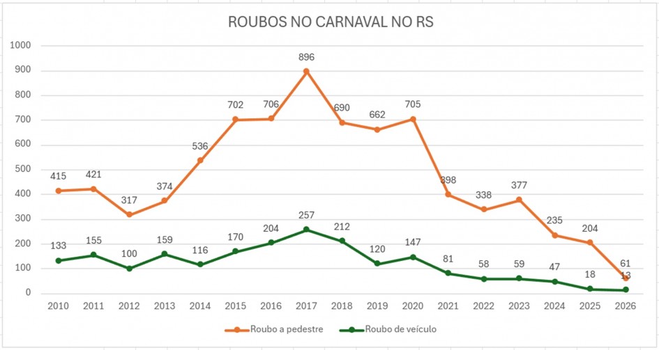 Os festejos de Carnaval no Rio Grande do Sul em 2026 foram os mais seguros da série histórica de registros da Secretaria da Segurança Pública (SSP) iniciada em 2010, em relação a mortes violentas e de roubos a pedestres e de veículos. Segundo balanço atualizado nesta sexta-feira (20/2), que marca o fim da Operação Carnaval das forças de segurança, o número de mortes violentas neste ano foi o mais baixo dos últimos 17 anos. Os dados englobam o período de sexta-feira a terça-feira de Carnaval de cada ano. O Rio Grande do Sul está diferente.