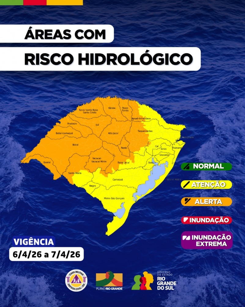 Neste cenário atenta-se para o risco de cheias em arroios, córregos e pequenos rios, além de alagamentos em áreas urbanas conforme a intensidade da chuva. Já os rios de maior porte devem registrar elevações moderadas, sem riscos de inundações, com recuperação dos limiares baixos.