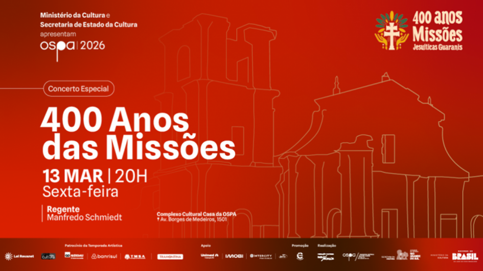 A Secretaria da Cultura (Sedac) promove o encontro artístico entre a Orquestra Sinfônica de Porto Alegre (Ospa) e a tradição gaúcha no concerto “400 Anos das Missões”. A apresentação integra as celebrações pelos quatro séculos das Missões Jesuíticas Guaranis e será realizada no Complexo Cultural Casa da Ospa nesta sexta-feira (13/3), às 20h. Sob regência de Manfredo Schmiedt, orquestra e diversos artistas convidados interpretam algumas das canções mais representativas da região missioneira. O espetáculo terá transmissão ao vivo pelo canal da Ospa no Youtube. Os ingressos vendidos por meio da plataforma Sympla já estão esgotados. No dia do evento, algumas entradas serão colocados à venda na bilheteria física, a partir das 15h.