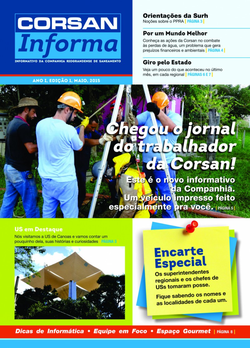Em suas oito páginas, o Corsan Informa pretende trazer a cara da Companhia e alcançar desde o funcionário que trabalha na sede, em Porto Alegre, até aquele que trabalha no extremo oeste (Barra do Quaraí), norte (Iraí), leste (Torres) ou sul (Chuí). E, para isso, contará com a participação dos trabalhadores, que poderão contribuir com textos, notícias, fotos e sugestões de pauta.