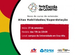 A Rede Escola de Governo, da Fundação para o Desenvolvimento de Recursos Humanos (FDRH), iniciará nesta sexta-feira (27) o curso Altas Habilidades/Superdotação. As aulas ocorrerão às sextas-feiras, das 19h às 22h30, e sábados, das 8h às 11h30, e das 13h30 às 17h30, no campus da Universidade de Cruz Alta (Unicruz), parceira desta ação. A carga horária é de 80h/aula. O público-alvo são professores das redes estadual e municipal que trabalham com a inclusão de alunos em seus ambientes escolares.