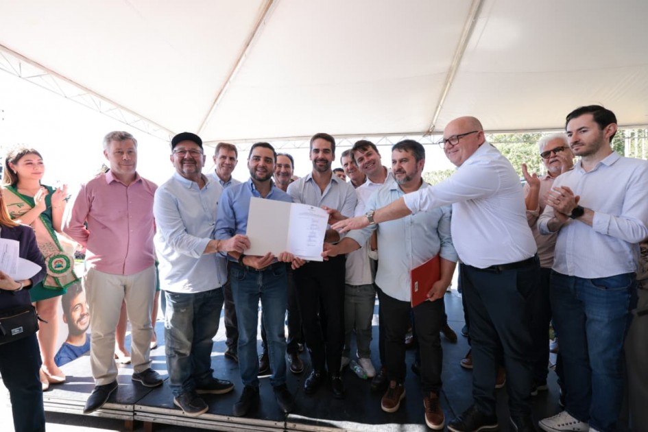 O governador Eduardo Leite e o vice-governador Gabriel Souza assinaram, nesta sexta-feira (17/4), a ordem de início para as obras do segundo lote do acesso municipal a Cerro Grande do Sul, na ERS-715. Com investimento de mais de R$ 38 milhões do Tesouro do Estado, serão pavimentados 14 quilômetros, em obra executada pelo Departamento Autônomo de Estradas de Rodagem (Daer), vinculado à Secretaria de Logística e Transportes (Selt).