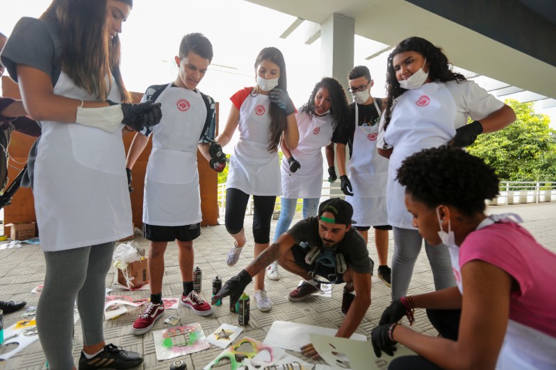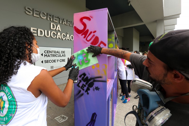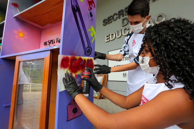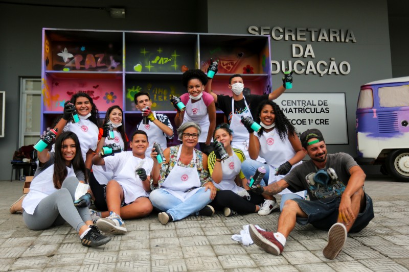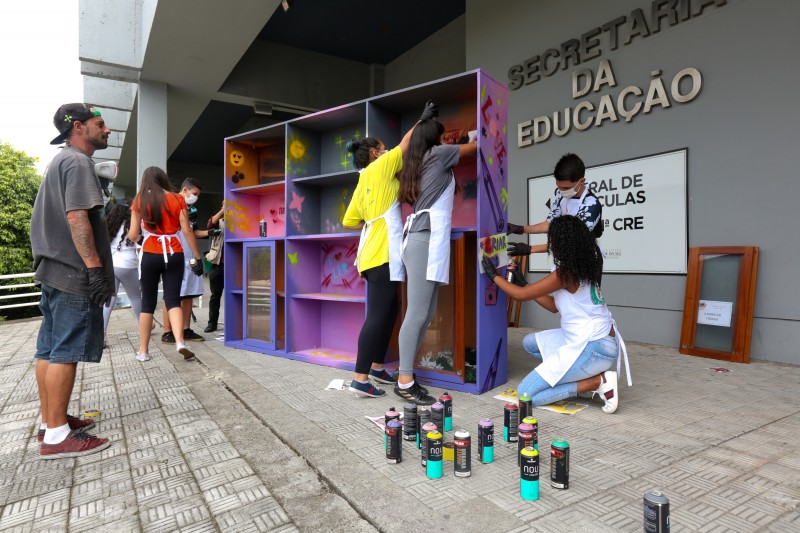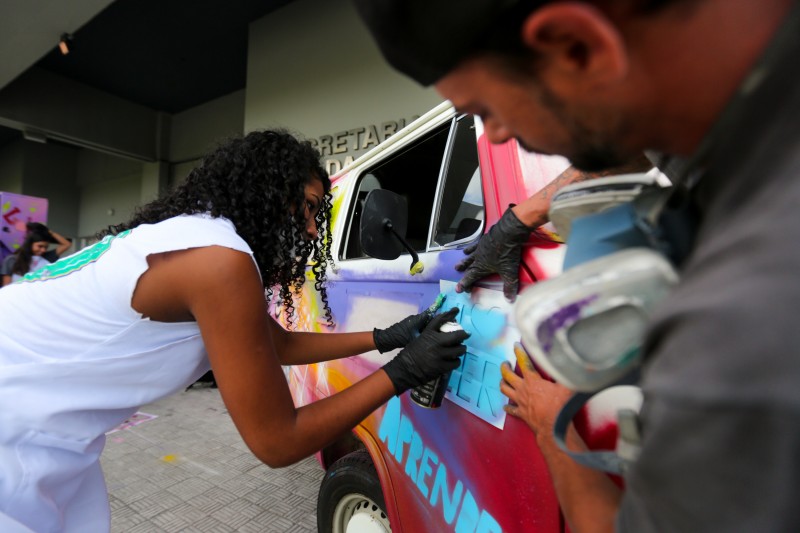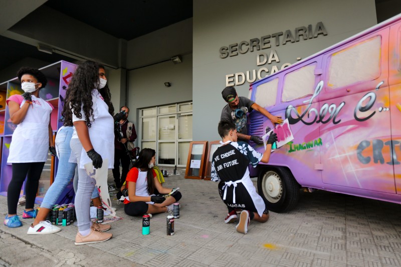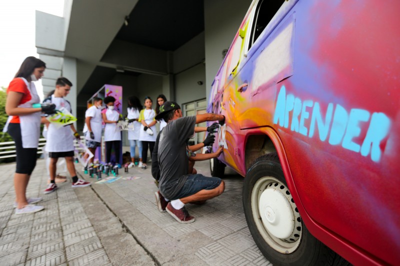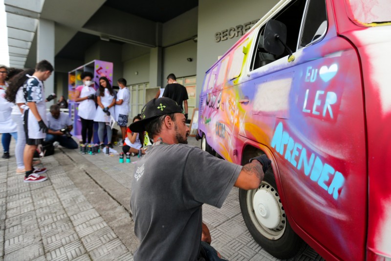 A iniciativa ganhou a parceria do artista urbano Lucas Anão e de estudantes do 6º ao 9º ano da Escola de Estadual de Ensino Fundamental Aurélio Reis, no bairro Jardim Floresta, na capital. Durante a tarde da última quarta-feira (27), eles grafitaram a lataria da veículo, conhecida agora como EducaKombi, e uma estante que servirá de biblioteca.