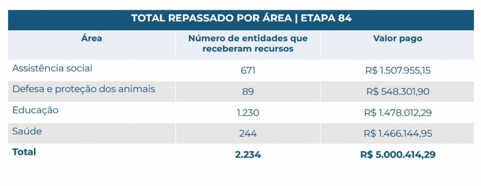 Ao longo de 2025, R$ 21,9 milhões foram encaminhados a instituições sociais, beneficiando 2.959 locais. Esse valor engloba pagamentos de diferentes períodos (visto que a quitação só é feita após regularização). Os repasses referentes às atividades do quarto trimestre de 2025 serão feitos nos primeiros meses de 2026.