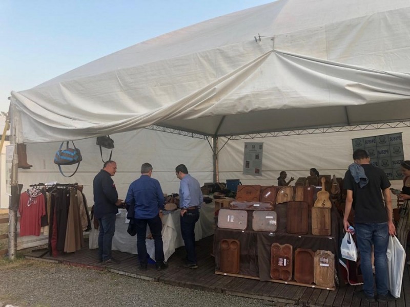 Localizado próximo ao pavilhão dos equinos, o estande tem atraído um movimento bem acima do esperado, e os motivos são dois: a movimentação recorde de público na feira e os preços competitivos das tábuas de carnes, porta-espetos e móveis produzidos a partir de sobras de madeiras doadas, além das bombachas e jaquetas de couro, feitas com retalhos de tecido cedidos por uma fábrica de móveis da região de Montenegro.