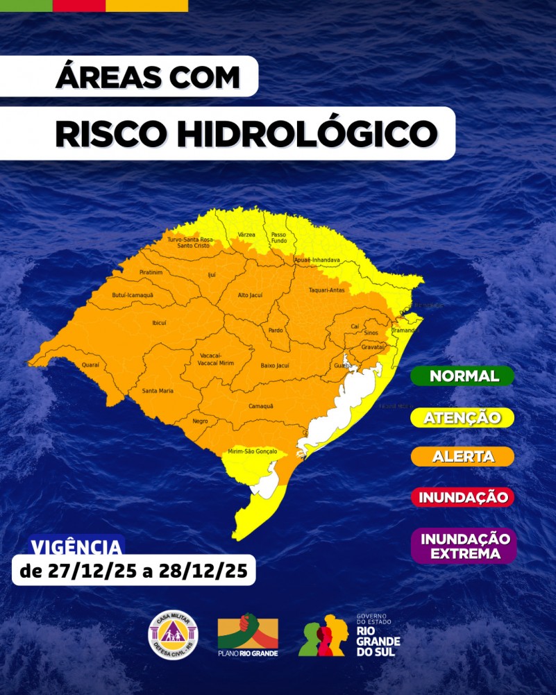 Em função dos acumulados de chuva observados e previstos para o estado, com volumes pontualmente elevados durante o período do aviso, é indicada a condição de Atenção e Alerta para as cidades em amarelo e laranja no mapa hidrológico, respectivamente. Atenta-se para o risco de elevações rápidas em arroios, córregos e rios menores, além de alagamentos em áreas urbanas e enxurradas de forma pontual em áreas de maior declividade, conforme a intensidade da chuva.