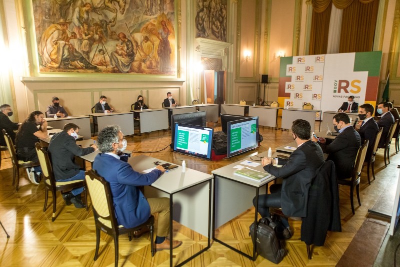 Para ampliar o diálogo sobre a Reforma Tributária RS com os deputados, o governador Eduardo Leite fez uma reunião, nesta quarta-feira (2/9), com líderes de bancada da base aliada. De forma presencial no Salão Alberto Pasqualini, no Palácio Piratini, ou por videoconferência, 12 partidos estiveram representados no encontro.