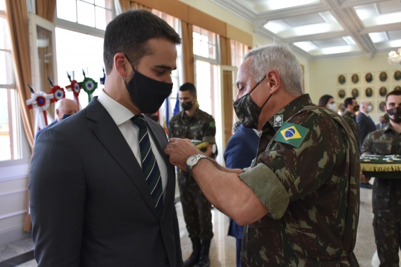 O governador Eduardo Leite e o vice-governador e secretário da Segurança Pública, Ranolfo Vieira Júnior, receberam nesta quinta-feira (24/9) a Medalha do Exército Brasileiro. Entregue pelo comandante Militar do Sul, general Valério Stumpf Trindade, a condecoração ocorreu em evento restrito no Quartel-general do Comando Militar do Sul, na capital.