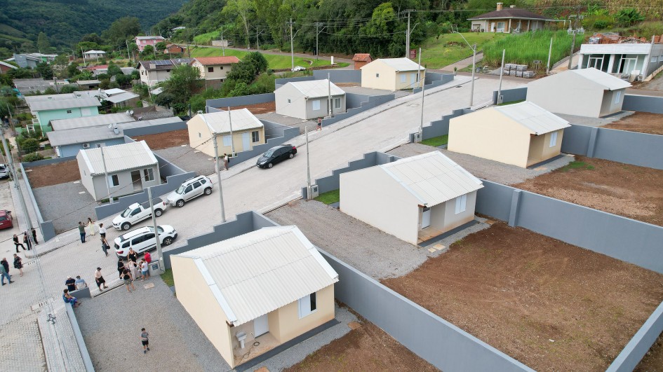 Na Serra, Eduardo Leite entregou 24 casas definitivas para famílias que perderam suas moradias nas inundações em Santa Tereza. O investimento é de R$ 3,3 milhões, além de R$ 3,5 milhões para as obras dos muros de contenção. A Secretaria de Desenvolvimento Urbano (Sedur) também aportou R$ 858 mil para o preparo dos terrenos.