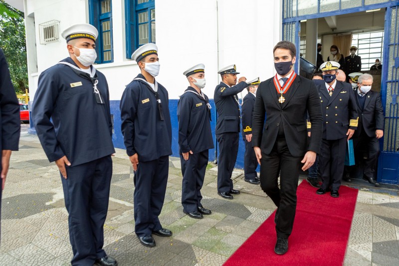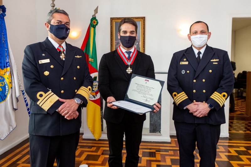 Com honrarias militares e uma cerimônia fechada, o governador Eduardo Leite recebeu, nesta segunda-feira (21/9), a medalha da Ordem do Mérito Naval, na categoria Grande Oficial. A entrega ocorreu na sede da Capitania Fluvial de Porto Alegre, pelas mãos do comandante do 5º Distrito Naval, vice-almirante Henrique Renato Baptista de Souza.