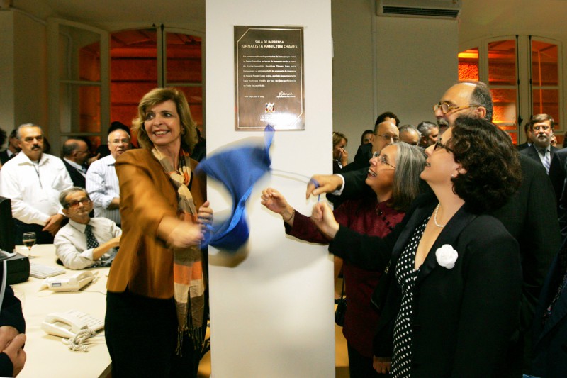 Em uma cerimônia marcada por depoimentos emocionados, a governadora Yeda Crusius inaugurou, na tarde desta quinta-feira (23), a Sala de Imprensa Hamilton Chaves e a Editoria de Fotografia Paulo Dias, da Assessoria de Comunicação Social do Governo do Estado, localizadas no subsolo do Palácio Piratini. O evento resgatou um pouco da história de vida dos homenageados e do trabalho realizado pela imprensa nos porões do Palácio Piratini, desde o período da Legalidade até os dias atuais.