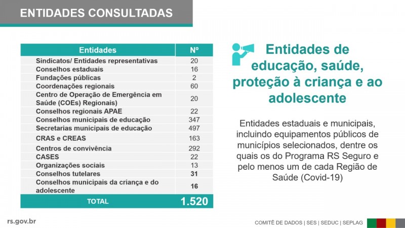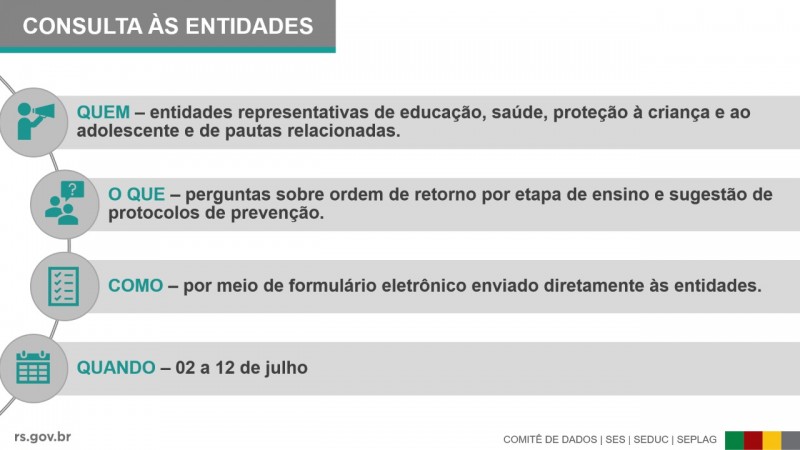 Com o objetivo de elaborar uma solução coletiva e colaborativa, o governo do Estado inicia, nesta quinta-feira (2/7), uma consulta a 1.520 entidades representativas sobre a retomada presencial das atividades de ensino. Até o dia 12 de julho, serão recebidas sugestões sobre o retorno das aulas e protocolos de prevenção por meio de formulário eletrônico.