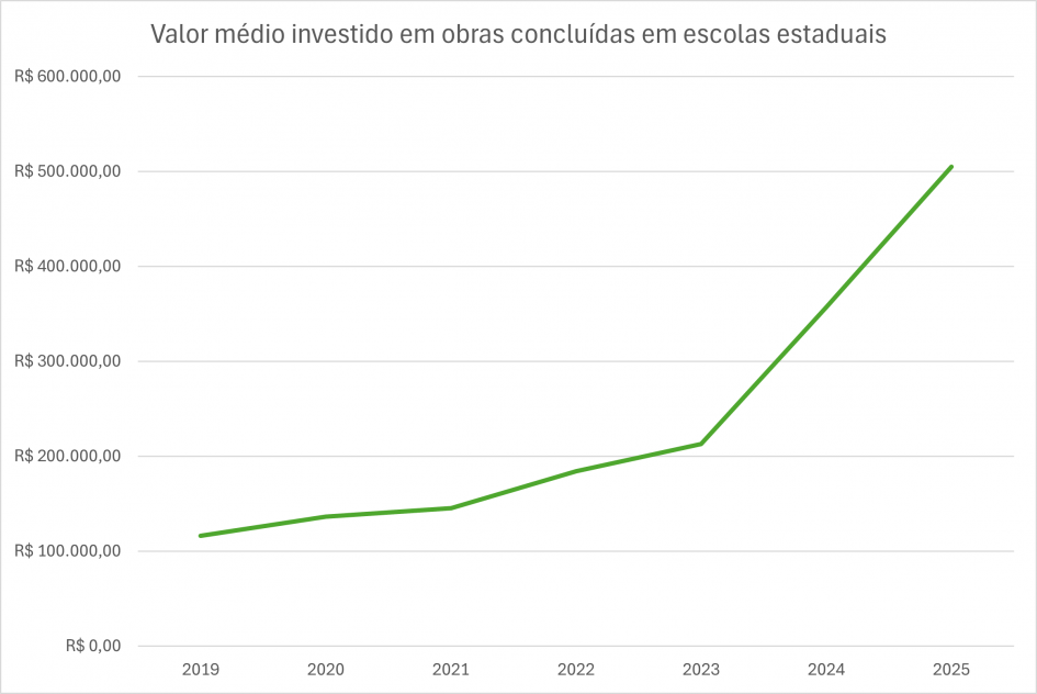 Desde o início da gestão Eduardo Leite, o valor médio investido pelo governo em obras aumentou mais de quatro vezes (gráfico abaixo):