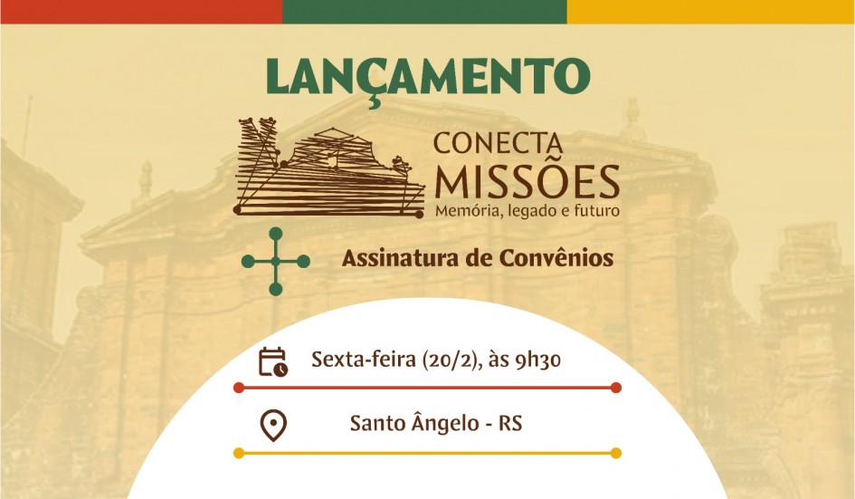 O governo do Estado, por meio da Secretaria da Cultura (Sedac), realiza nesta sexta-feira (20/2) o ato de lançamento do Conecta Missões: Memória, Legado e Futuro, iniciativa que une patrimônio, turismo, educação e economia criativa para a promoção do desenvolvimento regional. E que integra o calendário oficial das comemorações dos 400 Anos das Missões Jesuíticas Guaranis. A solenidade será no auditório do prédio 28 da Universidade Regional Integrada do Alto Uruguai (URI), em Santo Ângelo (RS).