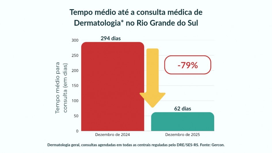 O governo do Estado, por meio da Secretaria da Saúde (SES), vem fortalecendo o acesso a consultas e procedimentos especializados pelo Sistema Único de Saúde (SUS) em diversas áreas, como é o caso da dermatologia. Entre dezembro de 2024 e dezembro de 2025, o tempo médio de espera para consultas diminuiu de 294 para 62 dias, uma redução de 79%.