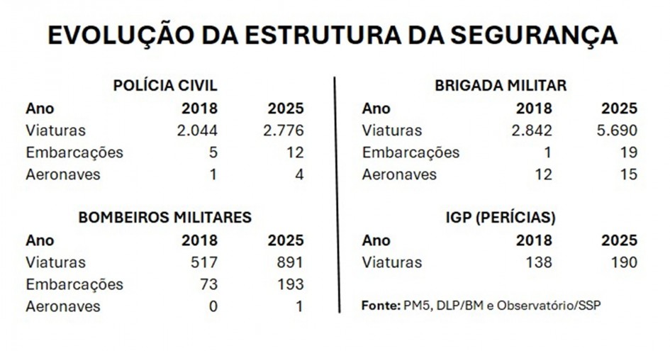 A Brigada Militar detém o maior número de aeronaves entre as forças de segurança do Estado, contando com 11 helicópteros e quatro aviões. O governo Leite atendeu a demanda de renovação da frota aérea, que ficou ainda mais evidente após as enchentes de 2024. Pela mesma razão, o número de embarcações da BM aumentou expressivamente, saltando de uma para 19 unidades no período. E somente em 2025, a Brigada recebeu 306 viaturas, 39 motos, 31 micro-ônibus e 17 motoaquáticas, uma renovação de veículos que vem sendo ampliada ano a ano.