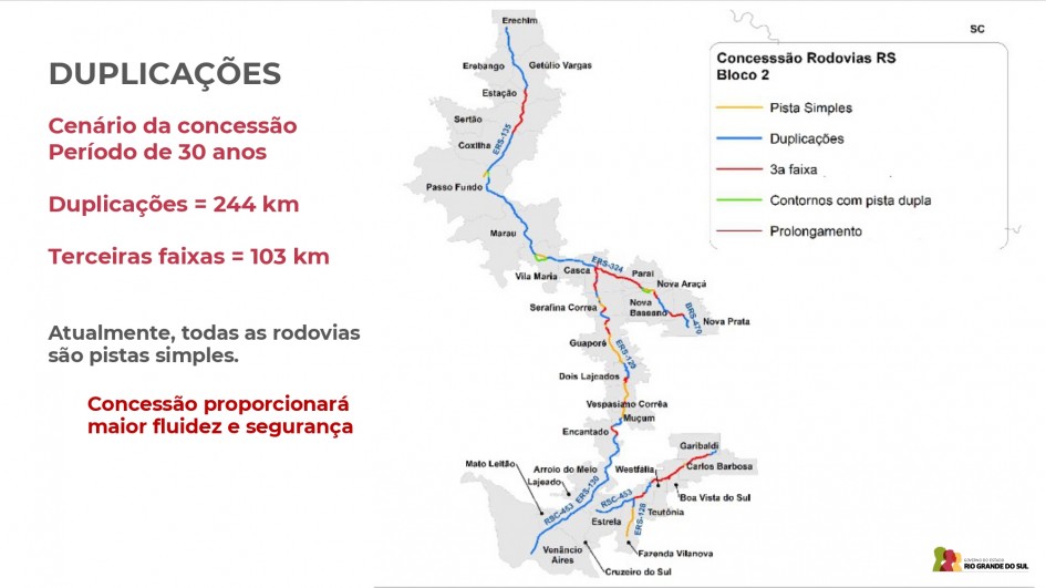 "O alto investimento previsto e a preocupação com a resiliência nas obras das rodovias do Bloco 2 se justificam, pois foram regiões fortemente afetadas pela enchente e contam apenas com estradas de pistas simples hoje em dia. A concessão vai garantir uma melhor infraestrutura, trazer mais segurança e desenvolvimento para o Vale do Taquari e região Norte", explicou o secretário da Reconstrução Gaúcha, Pedro Capeluppi.