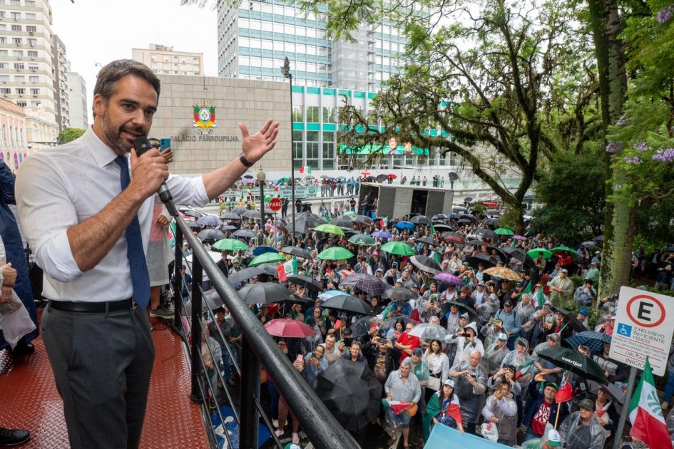 O governador Eduardo Leite participou, na tarde desta quarta-feira (10/12), de manifestação organizada pela Federação dos Trabalhadores na Agricultura (Fetag-RS) em frente ao Palácio Piratini, em Porto Alegre, onde reafirmou o compromisso do governo do Estado com a agricultura familiar e os produtores rurais gaúchos. Falando de cima do carro de som, Leite destacou que a pauta é “justa e legítima” e ressaltou o histórico de diálogo produtivo com a entidade.