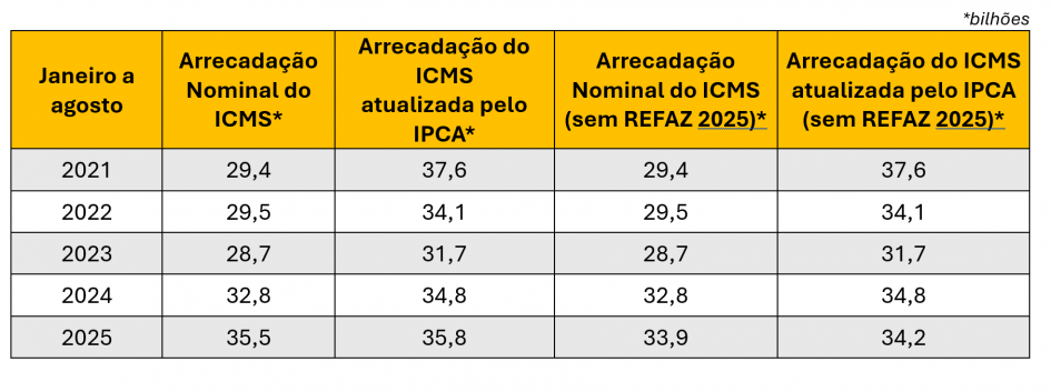 Em valores atualizados pelo IPCA, a arrecadação no período foi de R$ 35,8 bilhões (ganho real de 3% em relação a 2024). Porém, descontados os ingressos do Refaz Reconstrução, a arrecadação acumulada até agosto foi de R$ 34,2 bilhões em valores atualizados, representando perda real de 1,7% em comparação com 2024. Esse desempenho sugere que as reduções promovidas pela Lei Complementar 194/2022 nas alíquotas de combustíveis, comunicações e energia elétrica ainda não foram totalmente recuperadas.