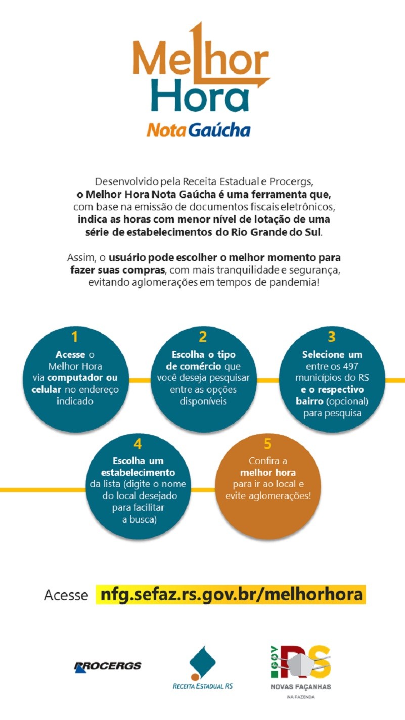 Visando contribuir para o combate à pandemia e fornecer mais uma possibilidade para auxiliar na prevenção à Covid-19, foi lançado nesta quinta-feira (30/7), o Melhor Hora Nota Gaúcha. Desenvolvida pela Receita Estadual em parceria com a Procergs, a ferramenta indica horários com menor nível de lotação para fazer compras em uma série de estabelecimentos do Rio Grande do Sul, abrangendo mercados, farmácias, pet shops, ferragens, livrarias, padarias, restaurantes e bares.