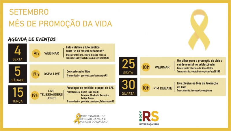A programação em 2020 será exclusivamente digital, devido à pandemia do novo coronavírus. “Já é tradicional no Rio Grande do Sul proporcionar no mês de setembro esses momentos de troca de experiência e aprendizados com os profissionais que trabalham na área saúde, na rede intersetorial, e também com a população em geral. Queremos levar um pouco da promoção da vida para a comunidade”, ressalta a coordenadora do setor de Saúde Mental da SES, Marilise Souza.